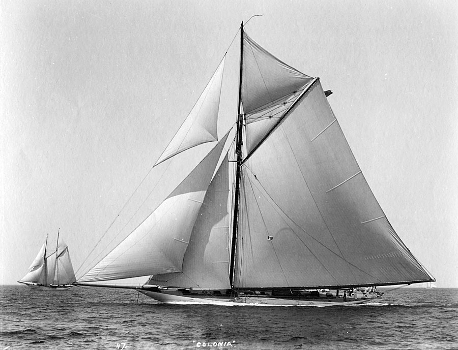 REF : 47 EDITION : 1893 DATE : 12 Jun 1895 COURSE : 0 DESCRIPTION SITE : The 85' steel cutter Colonia was built in 1893 by the Herreshoff Company for owners Archibald Rogers, J. Pierpont Morgan, F. W. Vanderbilt & W. K. Vanderbilt as a candidate for the defense of the 1893 America's Cup. It barely lost to Vigilant in the trials to defend the 8th America's Cup in 1893 with Captain Hank Haff. According to Americascup.com, "Vigilant won the 1893 American selection trials for the Cup defence and had beaten Colonia, Jubilee and Pilgrim." NOTES AMERICA-SCOOP :LICENCE : Public domain |