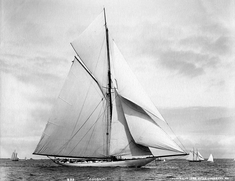 REF : 282 EDITION : 1893 DATE : 11 Aug 1893 COURSE : 0 DESCRIPTION SITE : The 85' steel cutter Colonia was built in 1893 by the Herreshoff Company for owners Archibald Rogers, J. Pierpont Morgan, F. W. Vanderbilt & W. K. Vanderbilt as a candidate for the defense of the 1893 America's Cup. It barely lost to Vigilant in the trials to defend the 8th America's Cup in 1893 with Captain Hank Haff. According to Americascup.com, "Vigilant won the 1893 American selection trials for the Cup defence and had beaten Colonia, Jubilee and Pilgrim." LICENCE : Public domain |