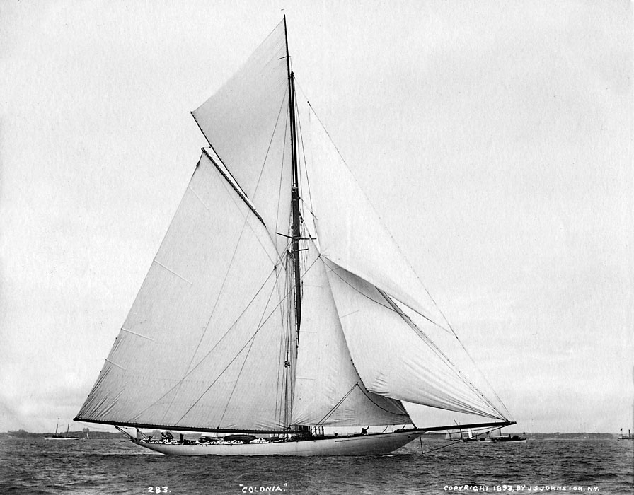 REF : 283 EDITION : 1893 DATE : 11 Aug 1893 COURSE : 0 DESCRIPTION SITE : The 85' steel cutter Colonia was built in 1893 by the Herreshoff Company for owners Archibald Rogers, J. Pierpont Morgan, F. W. Vanderbilt & W. K. Vanderbilt as a candidate for the defense of the 1893 America's Cup. It barely lost to Vigilant in the trials to defend the 8th America's Cup in 1893 with Captain Hank Haff. According to Americascup.com, "Vigilant won the 1893 American selection trials for the Cup defence and had beaten Colonia, Jubilee and Pilgrim." LICENCE : Public domain |