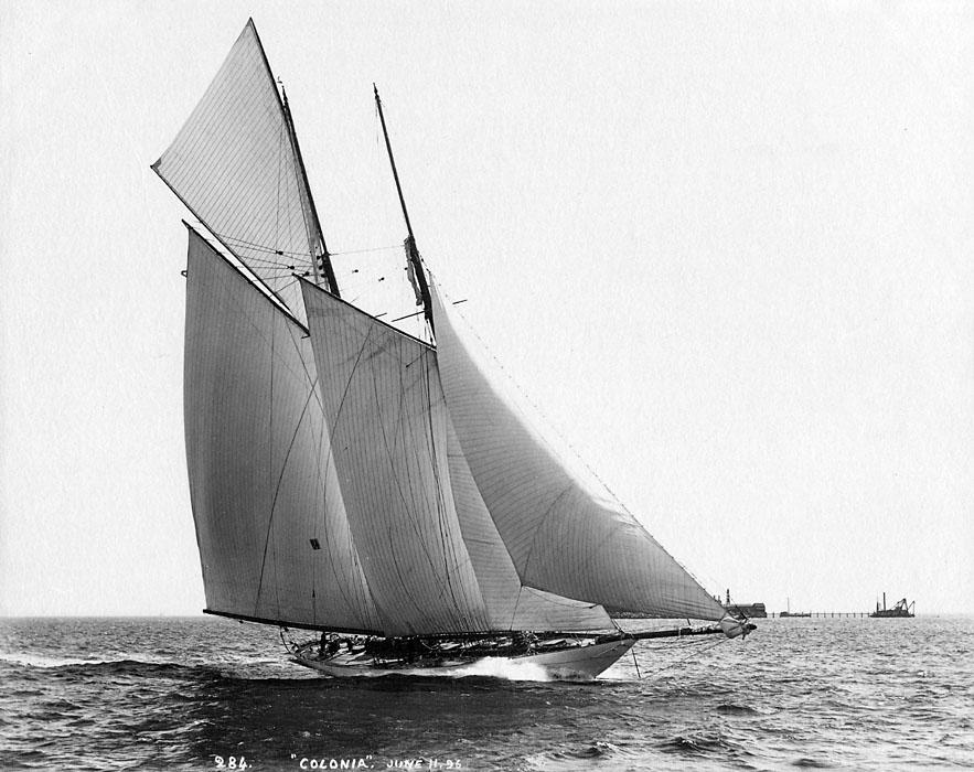 REF : 284 EDITION : 1893 DATE : 11 Jun 1896 COURSE : 0 DESCRIPTION SITE : The 85' steel cutter Colonia was built in 1893 by the Herreshoff Company for owners Archibald Rogers, J. Pierpont Morgan, F. W. Vanderbilt & W. K. Vanderbilt as a candidate for the defense of the 1893 America's Cup. It barely lost to Vigilant in the trials to defend the 8th America's Cup in 1893 with Captain Hank Haff. According to Americascup.com, "Vigilant won the 1893 American selection trials for the Cup defence and had beaten Colonia, Jubilee and Pilgrim." NOTES AMERICA-SCOOP :LICENCE : Public domain |