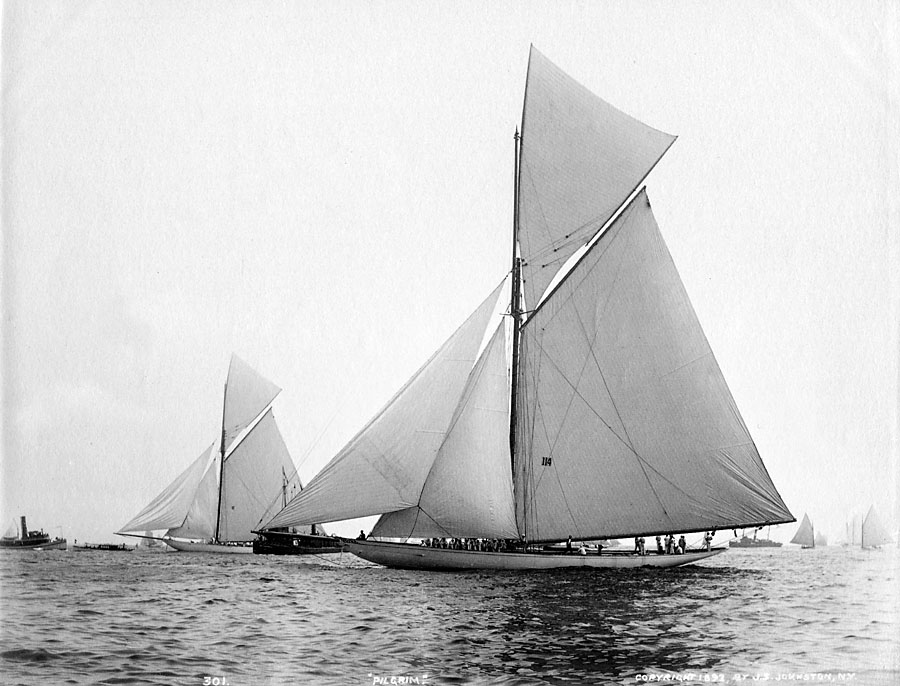 REF : 301 EDITION : 1893 DATE : COURSE : 0 DESCRIPTION SITE : The fin-keel cutter Pilgrim was built as a defense candidate for the 1893 America's Cup by a Boston syndicate headed by Bayard Thayer, General Charles Taylor, and William Amory. It was designed by Stewart and Binney. It measured about 124 in length, and like the other candidates (Vigilant, Colonia, and Jubilee) it had a cutter-type rig , with fidded topmast and fixed bowsprit. It also carried an experimental keel, weighted with ten tons of lead, which proved impractical. It withdrew in the trials after a rigging failure, and Vigilant went on to become the 1893 defender. NOTES AMERICA-SCOOP :LICENCE : Public domain |