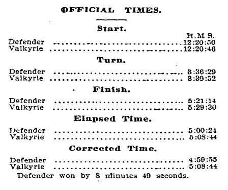Over the entire course, the Defender's elapsed time was 5 hours and 24 seconds; the Valkyrie’s elapsed time was 5 hours 8 minutes and 44 seconds, so that the Defender beat the Valkyrie 8 minutes and 26 seconds, and allowing for the 29 seconds which the Valkyrie has to give the Defender, the latter won by 8 minutes and 49 seconds.