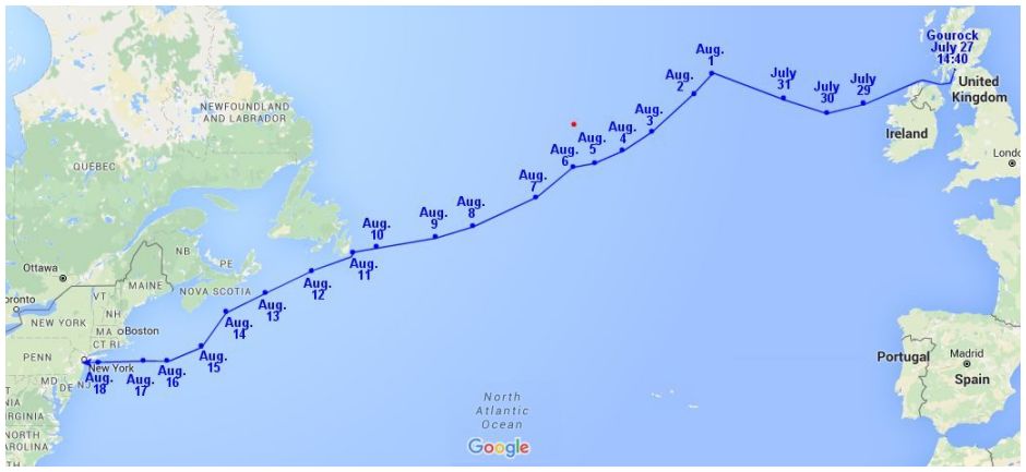 July 27- The Valkyrie left the other side on the afternoon of Saturday, July 27. She finished adjusting at 1:30 P.M., and at 2:40 she left Gourock in tow of the tug Vanguard. The wind at first was easterly, becoming variable later. At 3 A. M. she put Rathlin Island abeam, and at 9 let go her towboat and set her course northwest by west half west. At noon there was a fresh breeze blowing and the weather was cloudy with a heavy northwest swell. The wind had change to N-NW and was blowing strongly. July 28- The same wind prevailed the following day, July 28, and her course was laid west half south. It was cloudy during the day and a fresh breeze and northwest swell kept her pitching as on the day before. Later in the day it became squally. The vessel rolled from side to side, with her sails flapping heavily. On July 29 the prevailing winds were northwest by west by north-northwest. The vessel continued to roll in a high northwest swell, with her sails flapping to windward. That day she made 127 miles, her run the day before having been 148 miles. July 30- On the morning of July 30 the Valkyrie hailed along with light, variable breezes and squally weather. The wind shifted to northwest by west to west, and then to west by south. The breeze was light during the day accompanied by a northwest swell, and the Valkyrie added only eighty-three miles the distance she had traveled. July 31- On the morning of July 31 the winds were still light and variable. The weather was squally with rain. During the forenoon a moderate breeze sprang up, and blew west by south. The general direction of the Valkyrie’s course during the day was NW. At 3 P. M. the wind began to freshen, blowing then north by west. This was the beginning of a series of strong winds and rough weather that kept the two Captains and their British sailors busy for several days. During the afternoon the Valkyrie reefed her sails, but nevertheless she covered 151 miles, her best day’s run up to that time. Aug. 1- At noon on Aug. 1 a moderate gale was blowing from the northwest, the sky was overcast, and the sea was already roughening up. By 4 o'clock a heavy sea was running, and the Valkyrie was scudding along under shortened sail. Her run that day was 204 miles, which, with one exception, was her best record for any day. Aug. 2- The next day the gales continued, with a heavy sea, running, and for several hours the vessel lay hove to, laboring heavily. At 3:30 A. M. she got under way again and tacked toward the west. Heavy squalls and a very high confused sea prevailed, and the Valkyrie continually shipped large quantities of water. By noon of Aug. 2 the wind had begun to moderate. The gale, which was still considerable, came from the northwest and north-northwest. A very high sea kept the yacht rolling and pitching heavily and shipping much water over all. The run for Aug. 2 was only 81 miles. Aug. 3- The weather continued very rough during the night, and at 3 A. M. on Aug 3 the wheel ropes and the pin of the running tackleblock were carried away. The Valkyrie continued to ship water by the barrelful. The winds came from the northwest and north, and the Valkyrie’s course was laid for most of the day west by south. At 6 o'clock P. M. the gale was moderating, and the sea had gone clown somewhat. That night the Valkyrie made pretty good weather, and her run for the day was 160 miles. Aug. 4- At 2 A. M., on Aug. 4, the Valkyrie passed an unknown steamer bound west, to which she showed her night signals. At daybreak the sky was overcast and rain fell. During the forenoon a strong and increasing breeze came from the north, and the Valkyrie headed up to the northwest. At 11 A. M. she was compelled to heave to, and for several hours a fresh gale, with very high seas, kept the vessel laboring heavily. This continued until about 4 o'clock in the afternoon, when the gale moderated and the Captain kept his ship away, pitching and rolling heavily and shipping much water in the still high sea. Run for the day : 93 miles.