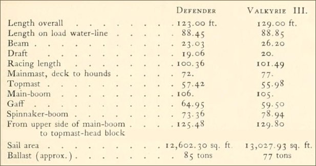 The approximate sail plan of the Valkyrie shows a mainsail of over 7,000 square feet, with a total area of working sails not far from 11,500 square feet, which is just about 1,000 square feet in her favour. This additional sail area gives the Valkyrie more sail to each foot of wetted surface, lateral plane, and to each ton of displacement.