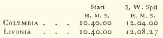 Le vice-commodore FRANKLIN OSGOOD est un travailleur infatigable à bord de son yacht, et, combiné avec COMSTOCK, son capitaine, il serait difficile de trouver une meilleure équipe pour skipper une goélette aurique. Livonia franchit la bouée Sandy Hook mais elle est maintenant désespérément battue. La brise commence alors à fraîchir considérablement et Columbia vient en direction de South-west Spit à un rythme vif, laissant son adversaire loin derrière. Quand Columbia s'approche de la bouée, il est intéressant de regarder l'organisation à bord, un homme à l'écoute principale, un à chacune des écoutes de foc et une dizaine à la trinquette. Le vice-commodore est très affairé et, sans se soucier des acclamations du public, il donne des ordres relatifs à la trinquette. C'est une belle photo alors que la goélette file à environ douze nœuds. La dernière chance de Livonia a été dissipée lorsque la brise s'est levée, car jusqu'à ce moment-là, aucun des bateaux ne pouvait finir la course dans la limite requise de huit heures. Livonia franchit de nouveau South-west Spit à 3:52 et, attrapant la brise, augmente sa vitesse mais perd toujours du terrain.