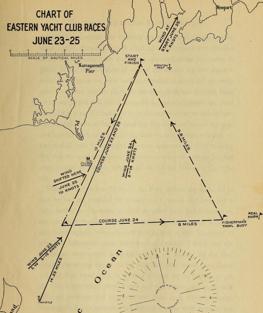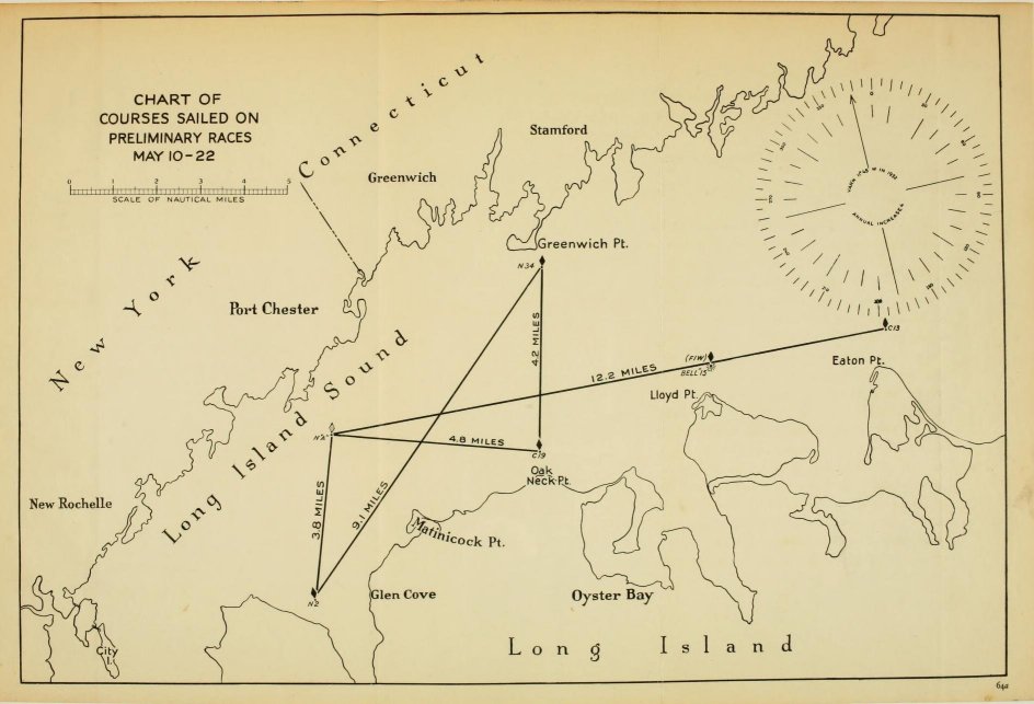 Le 11 juin était une belle journée, avec une brise légère et régulière de S.E. de 8 à 12 nœuds. La ligne de départ était établie à la bouée NA près de la côte du Connecticut. Il y avait des centaines de bateaux à moteur de toute nature, un grand nombre de yachts et deux grands paquebots de croisière dont l'un avait été affrété par le New York Yacht Club. Tout cela faisait un spectacle grandiose, une preuve de l'intérêt du public pour cette première réunion des candidats à la défense de la Coupe.