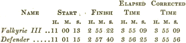 A mi-chemin vers la marque, le vent a viré de quelques points au sud et le bord retour se faisait au grand largue. A la marque extérieure, Defender devançait Valkyrie de 3 mn 27 s. et sur le bord retour de 4 mn 53 s. soit 8 mn 20 s. sur l'ensemble de la course plus une allocation de 29 s. Il n'y a rien eu de notable dans la course, les deux bateaux ont pu montrer ce qu'ils valaient par un temps pareil.