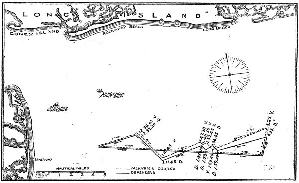 Environ deux minutes avant de coups de canon, les coureurs qui se trouvaient à l'ouest de la ligne ont empanné tribord amures pour revenir vers la ligne, direction sud-est. Sur leur route à environ six cents mètres de la ligne, se trouvait le grand Steamer City of Yorktown, transportant des spectateurs. Defender passa à l'arrière et sous le vent du steamer, et Valkyrie au vent.